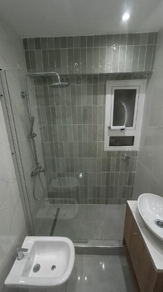 Baño con mampara de vidrio templado y ducha en desnivel.